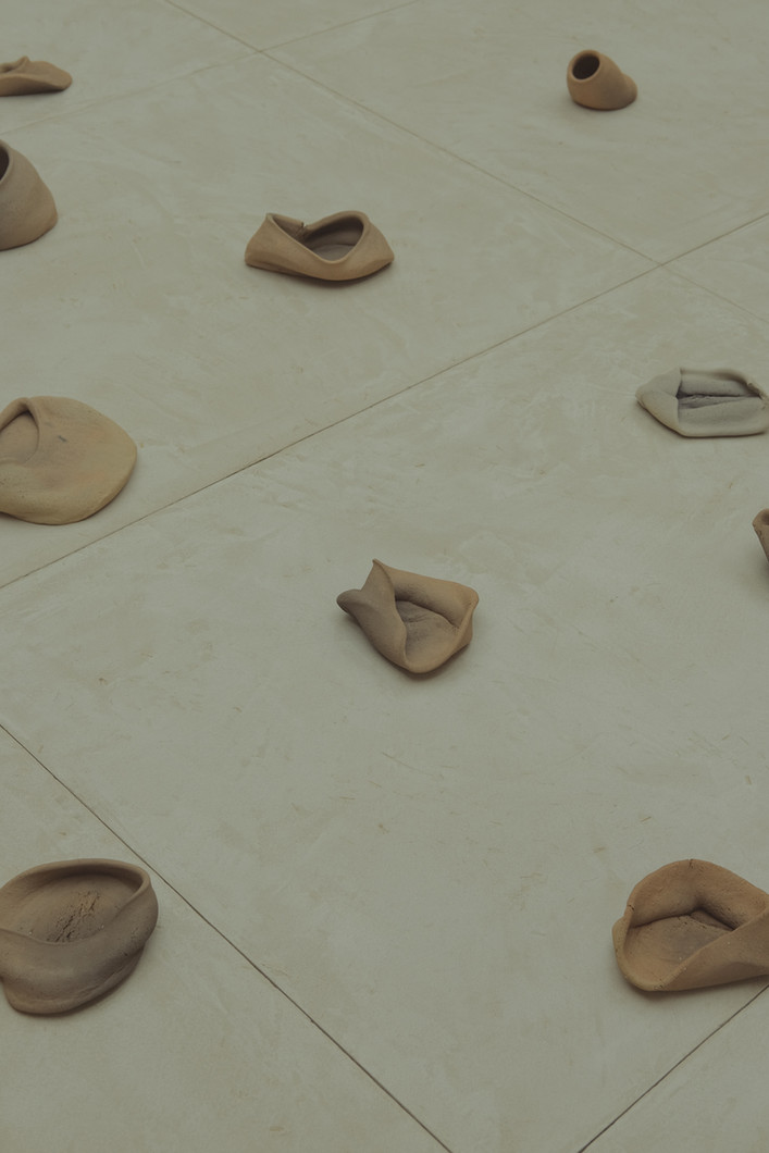 本展では、安田が手捻りで成形した壺や器を落下させ、野焼きで焼成した新作群を発表します。自然のはたらきに身を任せて歪んだ土器は、まるで地面に溶け込むように、あるいは動物が静かに腰を下ろすように、生々しい襞(ひだ)やしわをまといながらも、どこか浮遊感のある佇まいを湛えています。土、水、火という自然物から生まれたこの作品には、時間や重力といった理(ことわり)さえも、その襞に折り込まれているのです。